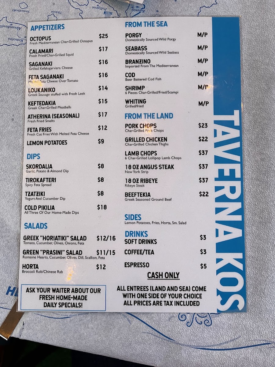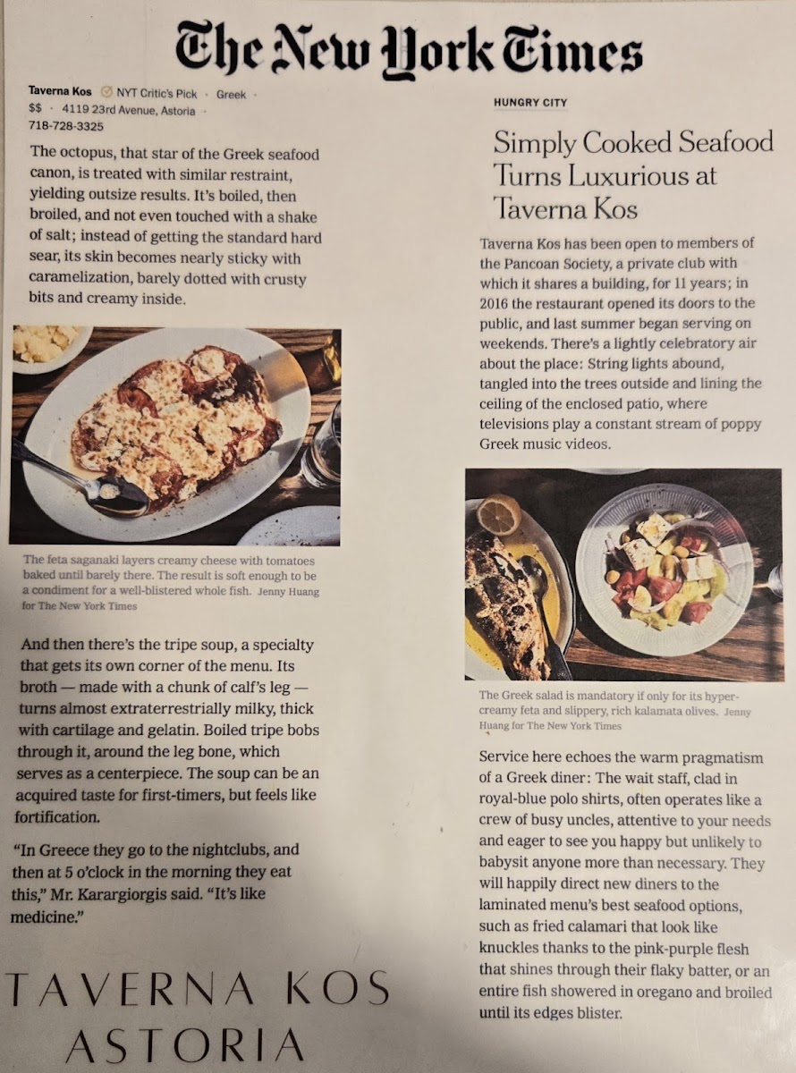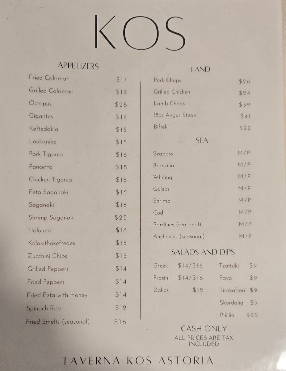 Overall, Taverna Kos Astoria’s menu is a testament to the flavors of Greece, offering something for everyone. Whether you’re in the mood for seafood, grilled meats, or a light salad, this place provides an authentic and satisfying dining experience.